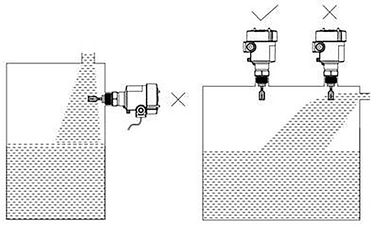 二、音叉液位開(kāi)關(guān)測量注意事項 一般而言,為了保證音叉液位開(kāi)關(guān)能夠可靠測量,需要注意一下幾點(diǎn)事項: 1、理論上講,音叉液位開(kāi)關(guān)可以根據需要安裝在任何位置,但如果安裝在入料口位置而造成的測量誤差,甚至損壞儀表,所以,在安裝音叉液位開(kāi)關(guān)時(shí),應盡量避開(kāi)物料的進(jìn)出口進(jìn)行安裝。音叉液位開(kāi)關(guān)的正確安裝方式如下: